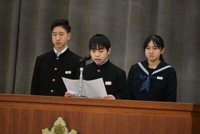 12.24(水)、令和7年度2学期の終業式が行われました。終業式では、各学年の代表生徒たちによる「2学期を振り返って」の発表があり、2学期に頑張ったことや3学期に向けての目標を発表してくれました。
